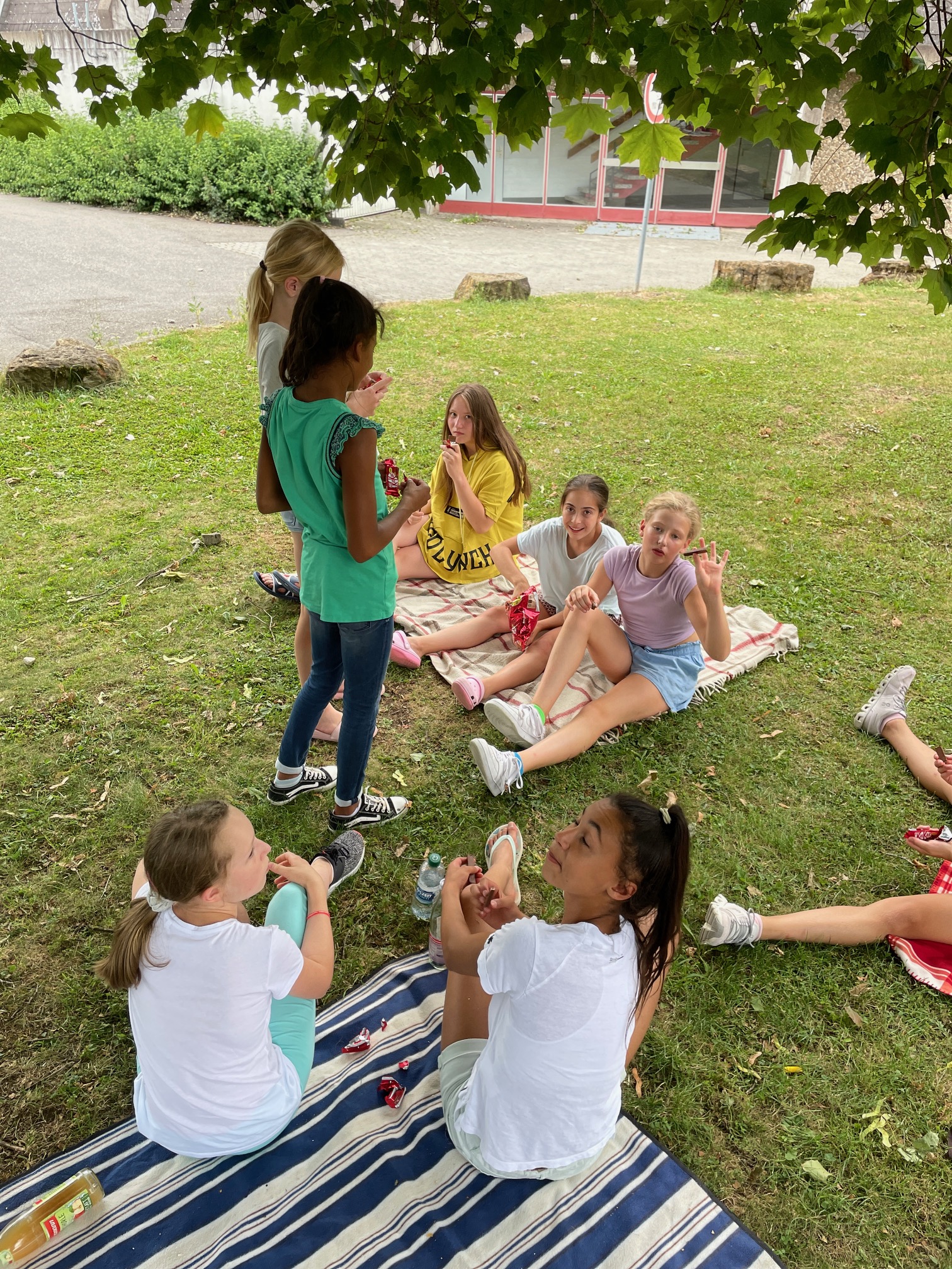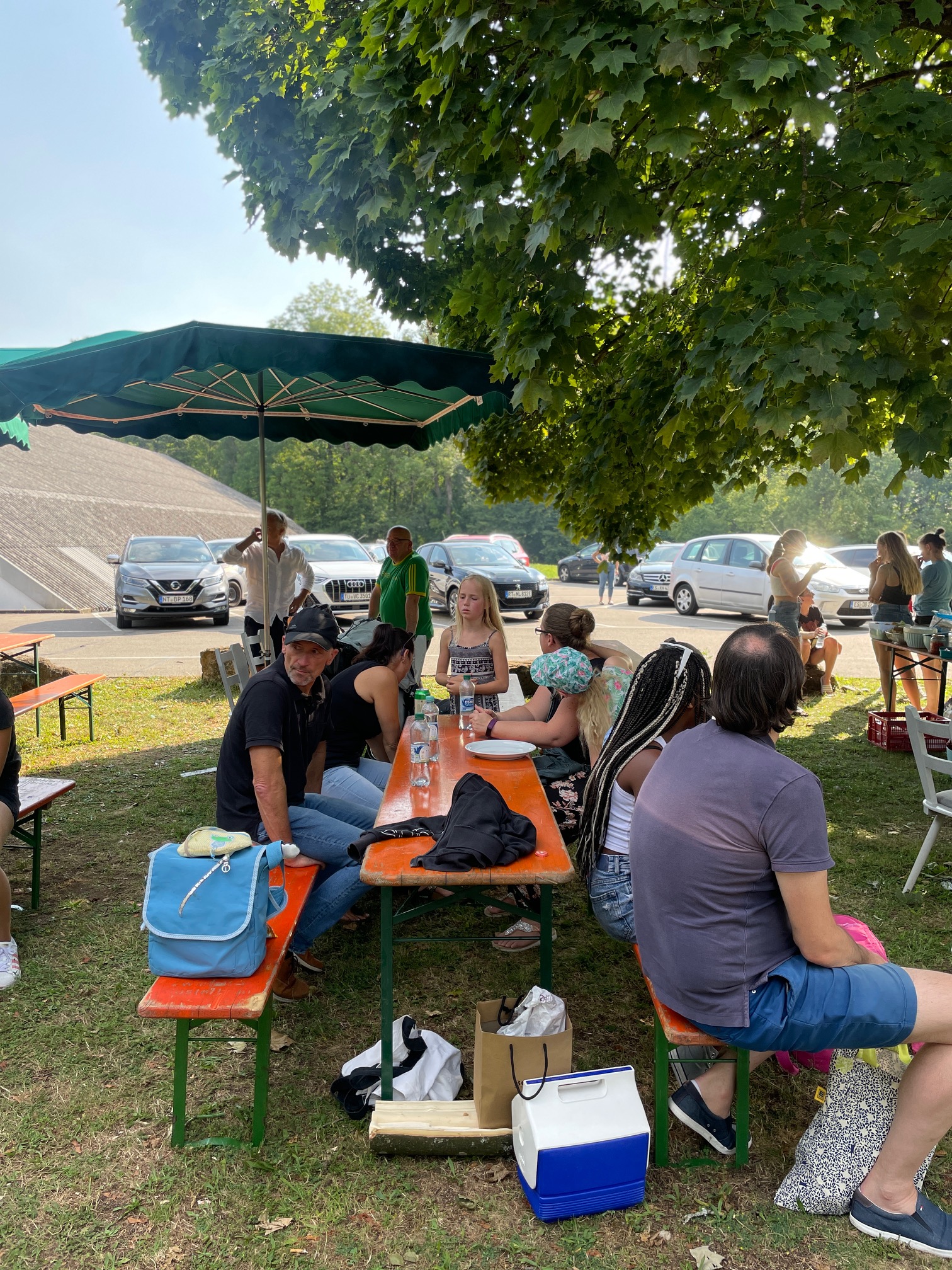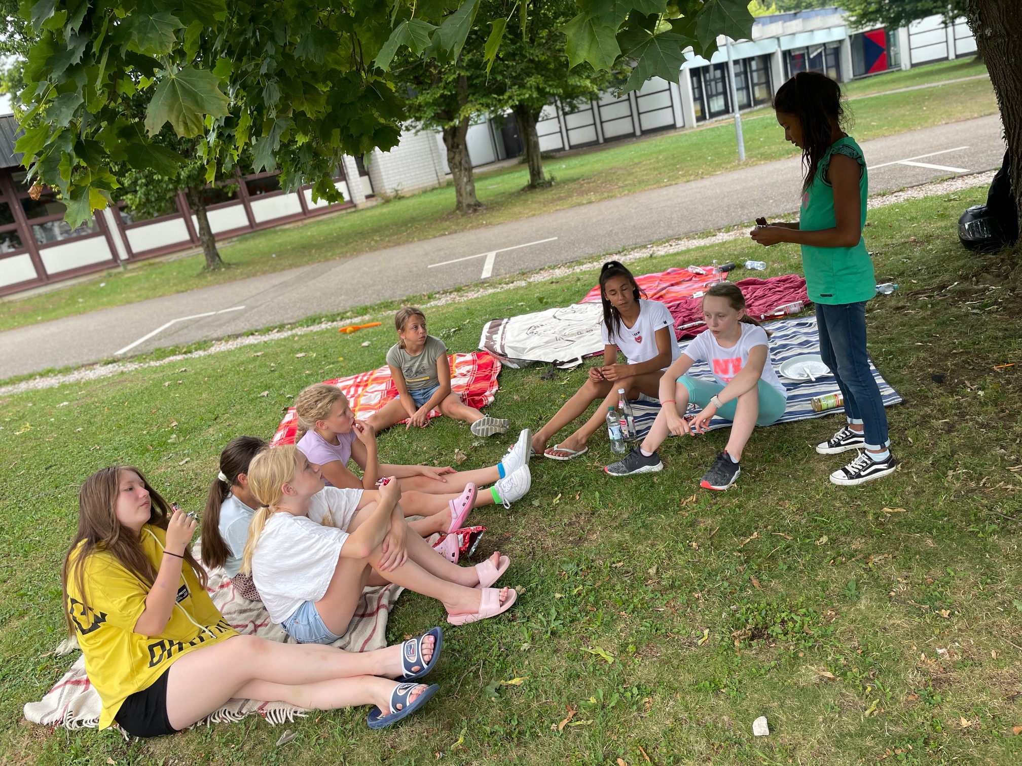 Da bereits am Nachmittag der Ausklang bei gemeinsamen Grillen auch mit den jüngeren Turnerinnen stattfinden würde, hieß es nach dem Training: Vorbereiten und Zeit überbrücken. Das viel den Turnerinnen allerdings nicht schwer. Neben einer kleinen Stärkung mit den Resten von Frühstück und Abendessen wurden kurzerhand LKW-Schläuche und Styroporbretter geschnappt und zielstrebig in Richtung Erms, der Fluss hinter der Halle, marschiert. Rasant den Bach herunterzufahren, oder eine Wasserschlacht zu veranstalten, bereitete große Freude. Im Anschluss blieb noch Zeit für eine weitere Runde Volleyball und Brennball, sowie einem Ausflug zur Neckartenzlinger Eisdiele. Am späten Nachmittag kamen dann auch die jüngeren Turnerinnen mit ihren Familien. Mit vielen, leckeren Salaten und Gegrilltem konnte so der sehr nette Sommerabschluss gefeiert werden.