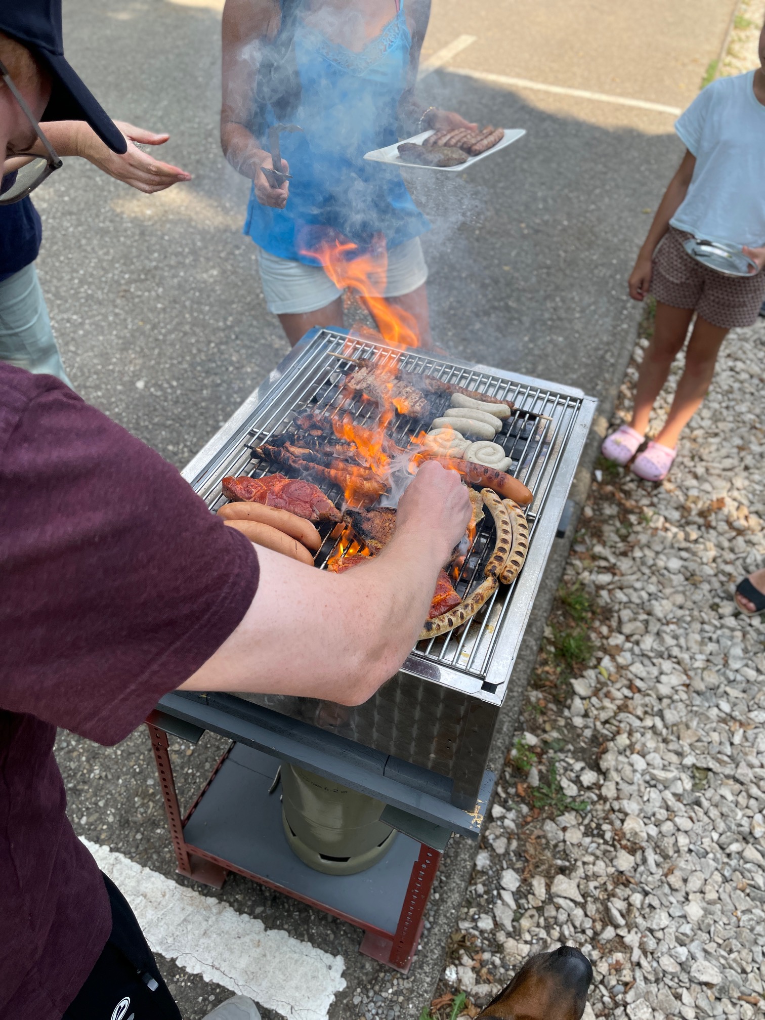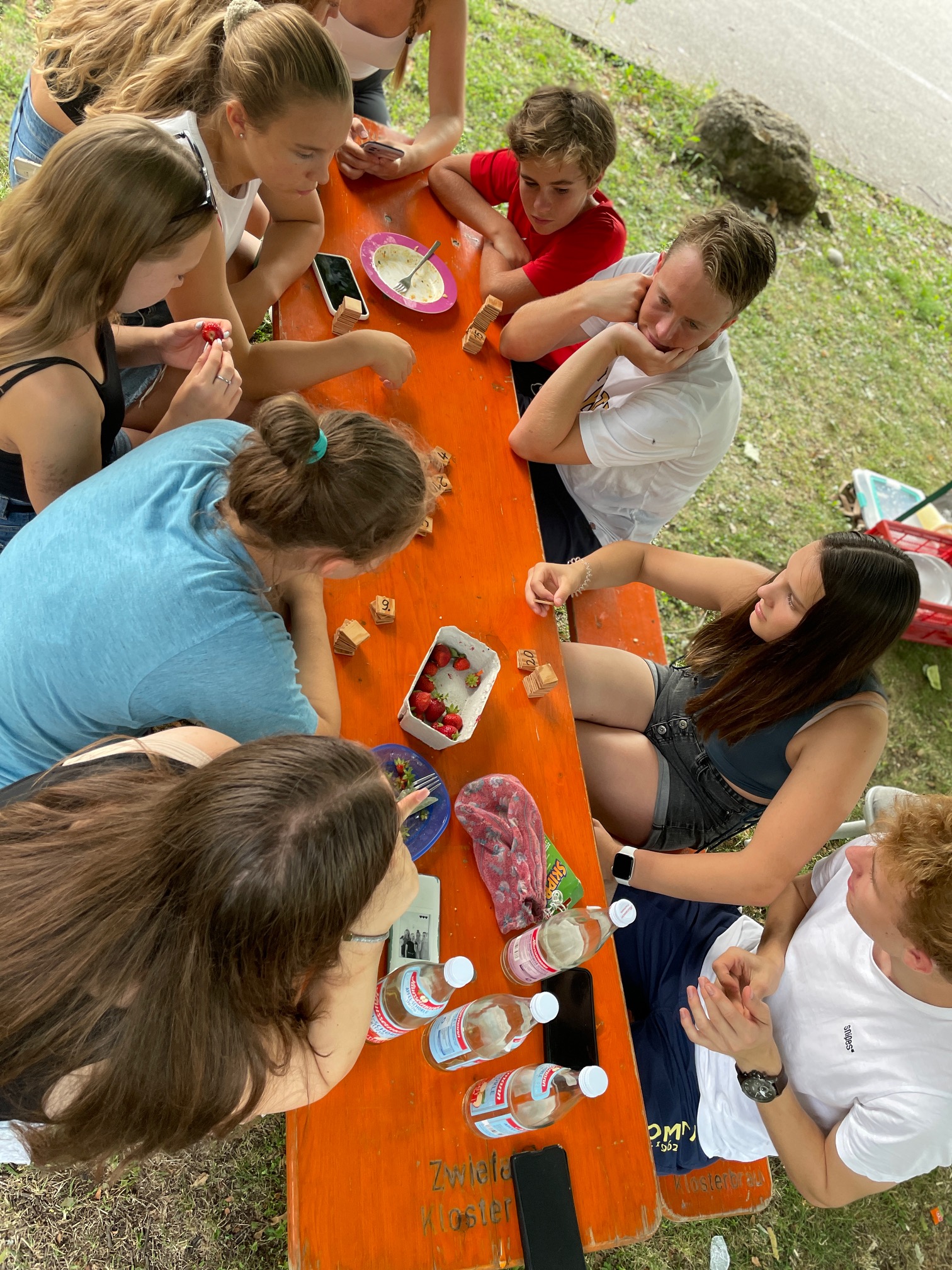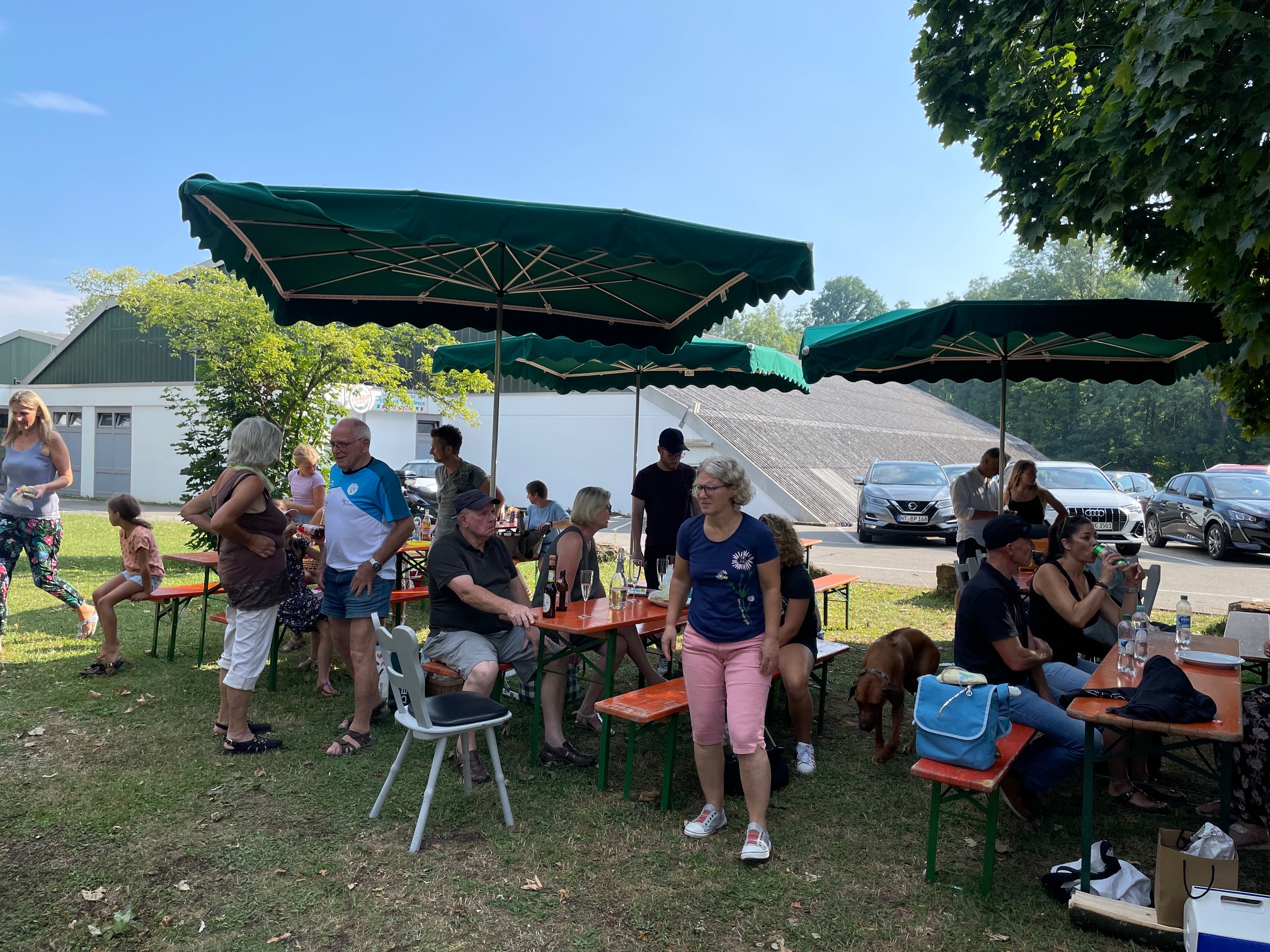 Da bereits am Nachmittag der Ausklang bei gemeinsamen Grillen auch mit den jüngeren Turnerinnen stattfinden würde, hieß es nach dem Training: Vorbereiten und Zeit überbrücken. Das viel den Turnerinnen allerdings nicht schwer. Neben einer kleinen Stärkung mit den Resten von Frühstück und Abendessen wurden kurzerhand LKW-Schläuche und Styroporbretter geschnappt und zielstrebig in Richtung Erms, der Fluss hinter der Halle, marschiert. Rasant den Bach herunterzufahren, oder eine Wasserschlacht zu veranstalten, bereitete große Freude. Im Anschluss blieb noch Zeit für eine weitere Runde Volleyball und Brennball, sowie einem Ausflug zur Neckartenzlinger Eisdiele. Am späten Nachmittag kamen dann auch die jüngeren Turnerinnen mit ihren Familien. Mit vielen, leckeren Salaten und Gegrilltem konnte so der sehr nette Sommerabschluss gefeiert werden.